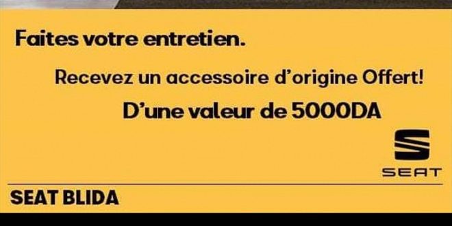 Pour fêter l’ouverture de son nouveau site, Seat Halil Blida offrira, du 14 au 21 Juin, un cadeau d’une valeur de 5000 DA pour chaque entretien au Service Après vente (SAV).  Ainsi, Halil de Blida, agent distributeur de Sovac Algérie, lance cette possibilité de repartir avec un accessoire d’origine Seat …