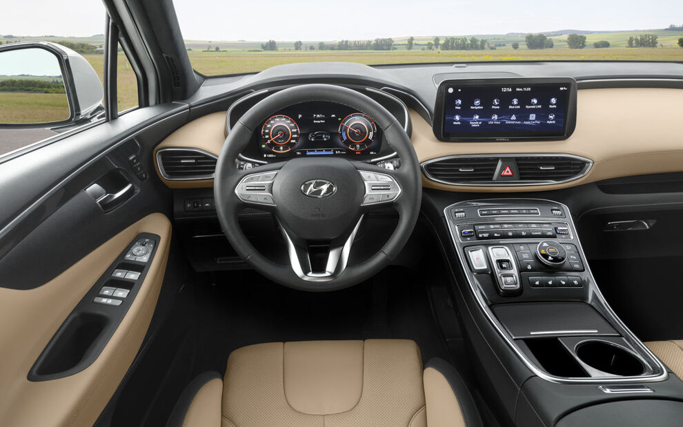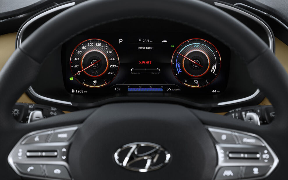 Le nouvel intérieur Santa Fe offre désormais plus d’espace, de confort et de commodité par rapport au modèle précédent. Il amène la voiture à un nouveau niveau de luxe avec chaque composant fini dans des matériaux doux au toucher de première qualité. Il présente un nouveau design de tableau de bord inférieur, une console centrale redessinée et un nouvel écran tactile AVN de 10,25 pouces. La nouvelle console centrale flottante avec boutons Shift-by-Wire est connectée au crash pad dans une courbe lisse. Pour la première fois, le nouveau Santa Fe est livré avec un sélecteur de mode Terrain: un bouton de commande situé dans la console centrale pour basculer facilement entre les différents modes de conduite.