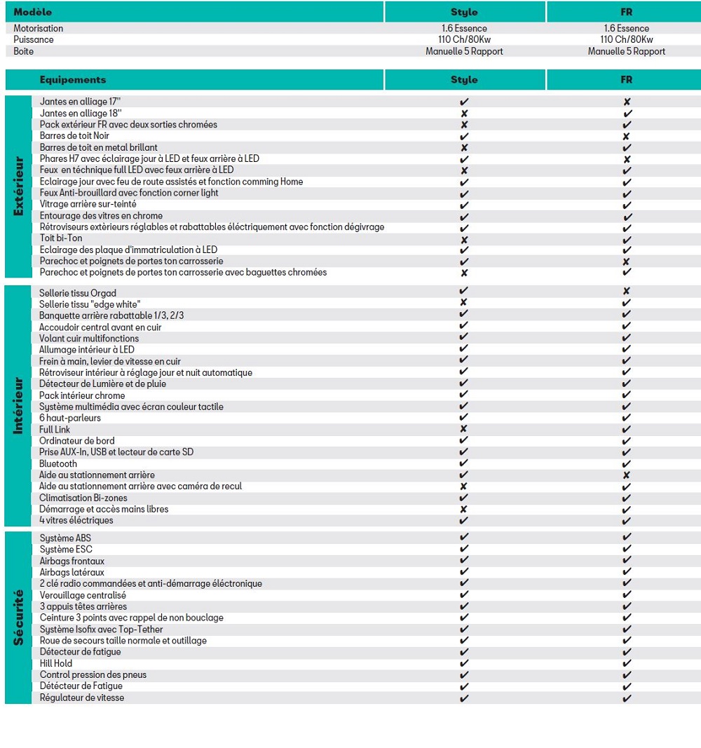 Sur le plan sécurité, les deux versions style et Fr disposent d’un régulateur de vitesse, d’un détecteur de fatigue et d’un contrôle de pression de pneu.