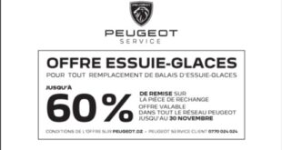 Peugeot Algérie lance les offres après-vente spéciales automne dans tout son réseau et Eurorepar car service Algérie. Les offres promotionnelles concernent le freinage, les optiques et les balais d’essuie-glaces, à savoir : OFFRE FREINAGE : Pour tout remplacement de plaquettes ou disques de frein, le client bénéficiera de : …
