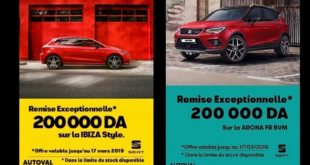 Sovac Algérie prolonge l’offre commerciale sur les Seat Ibiza Style et Arona FR proposée, chacune, avec une remise de 200 000 DA ; une offre valable jusqu’au 17 mars. La Seat Ibiza en finition Style qui bénéficie d’une offre de 200 000 DA ; soit au prix de 1 990 …